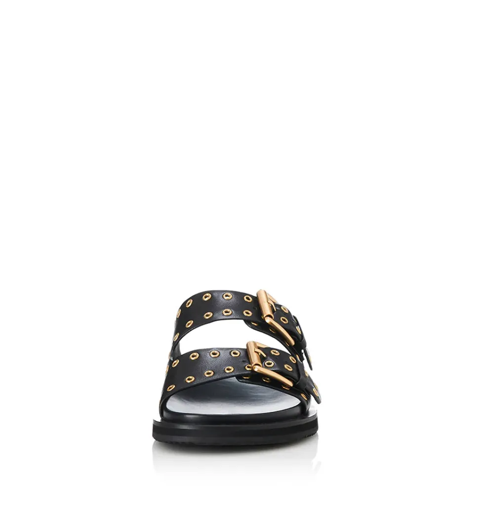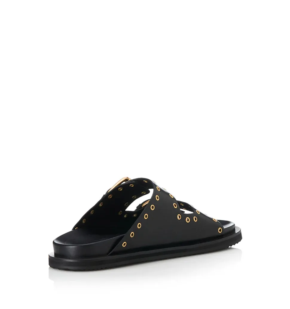 The Patsy Sandal in Black Leather by Alias Mae. Made from 100% Leather with Gold hardware and eyelets.