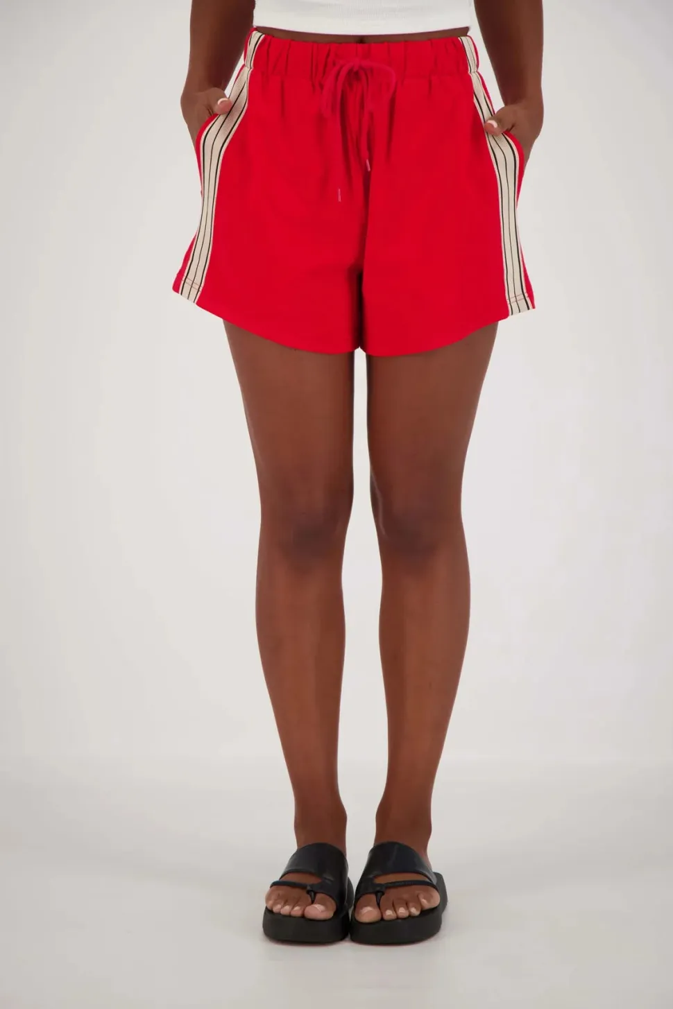 Ethically Made/ 100% cotton / Relaxed fit / Elastic waistband with drawstring / Pockets / Length size small: Outer leg: 33cm from top of waistband to hem. Inside Leg: 8cm; Front Rise: 32cm; / High waisted / White stripe down side / Elegant design for all day comfort / Easy care