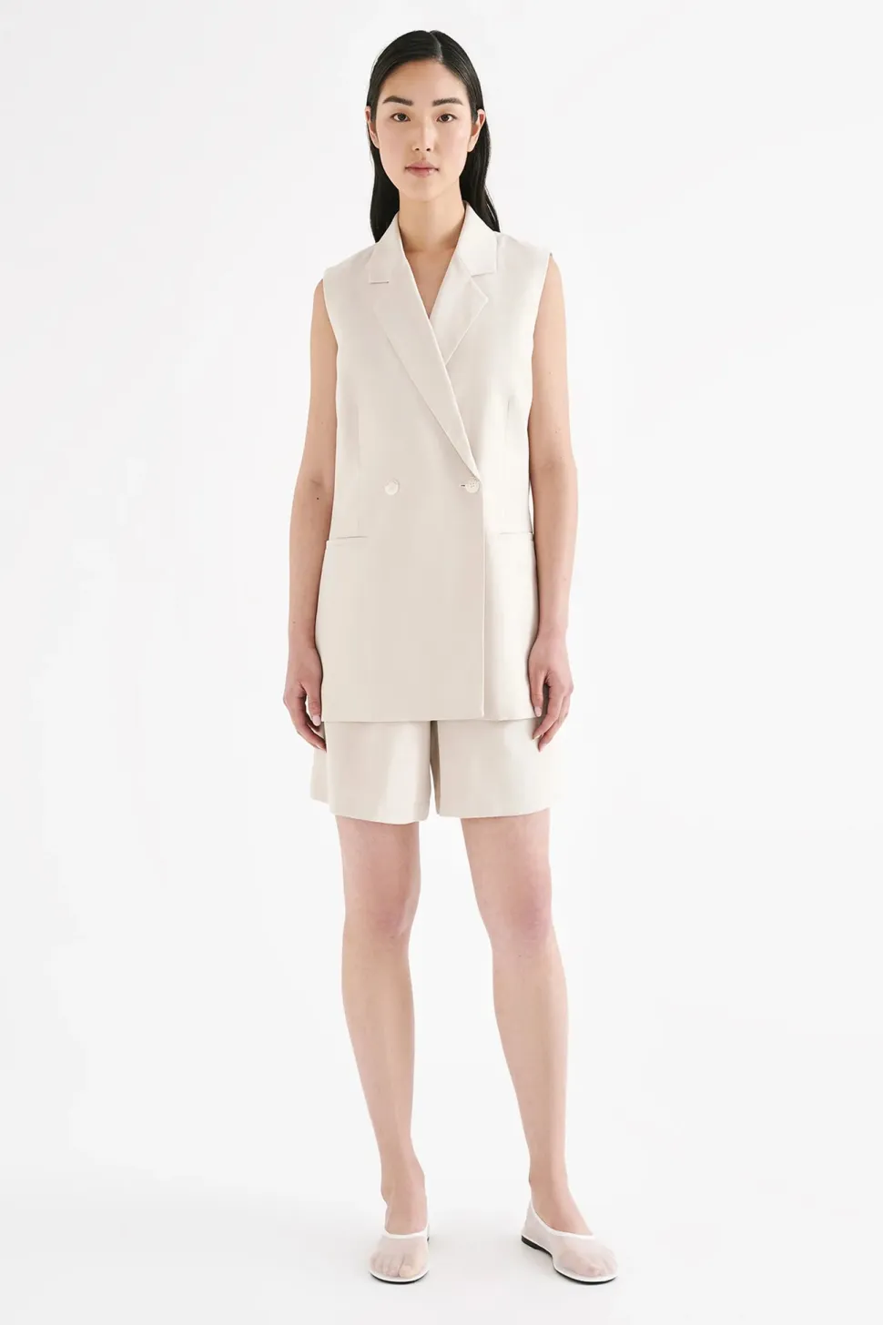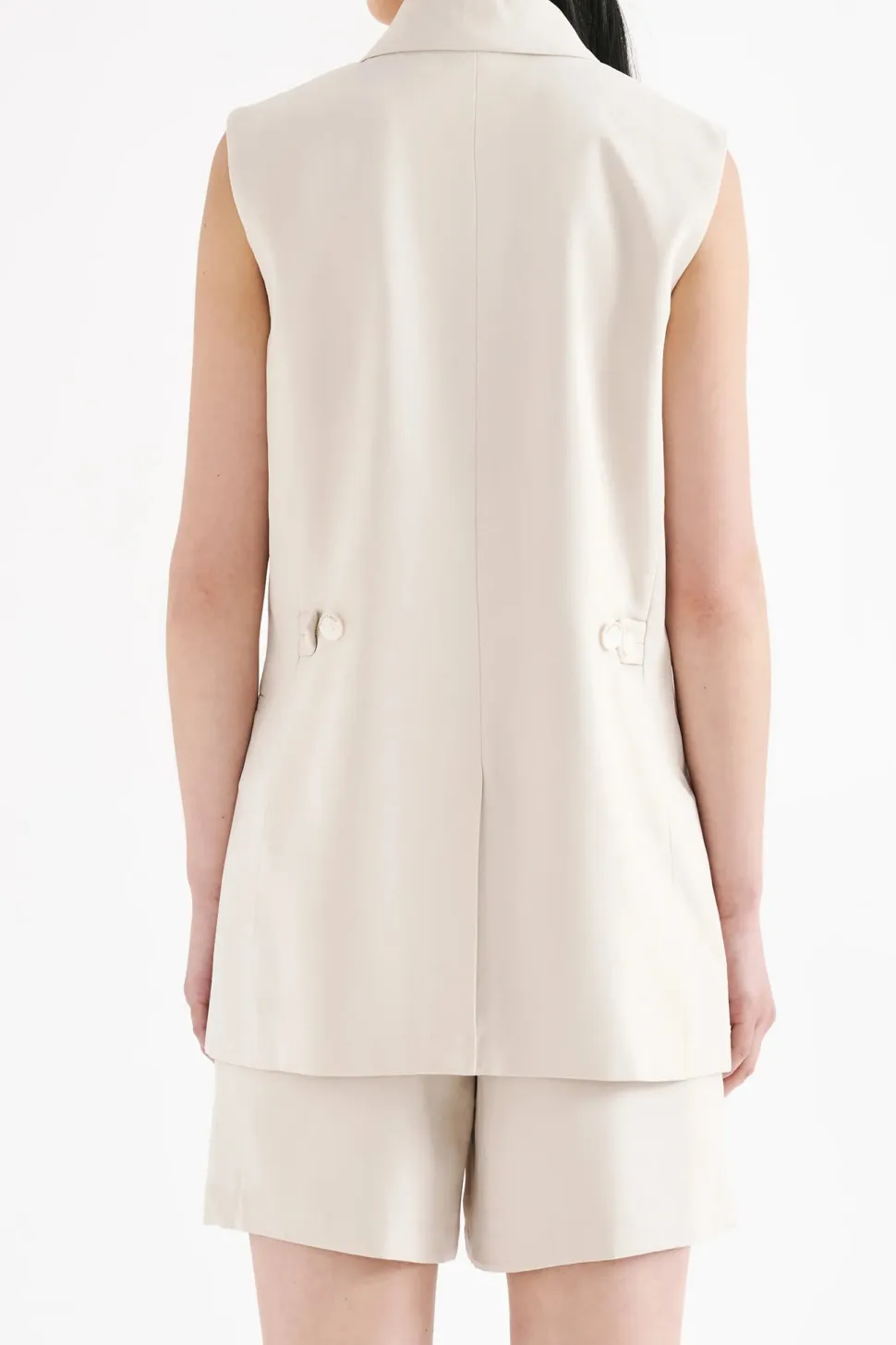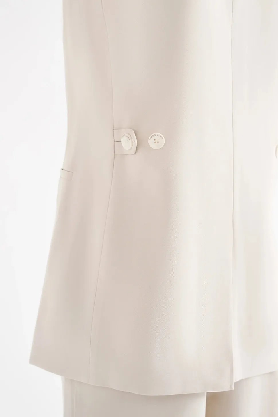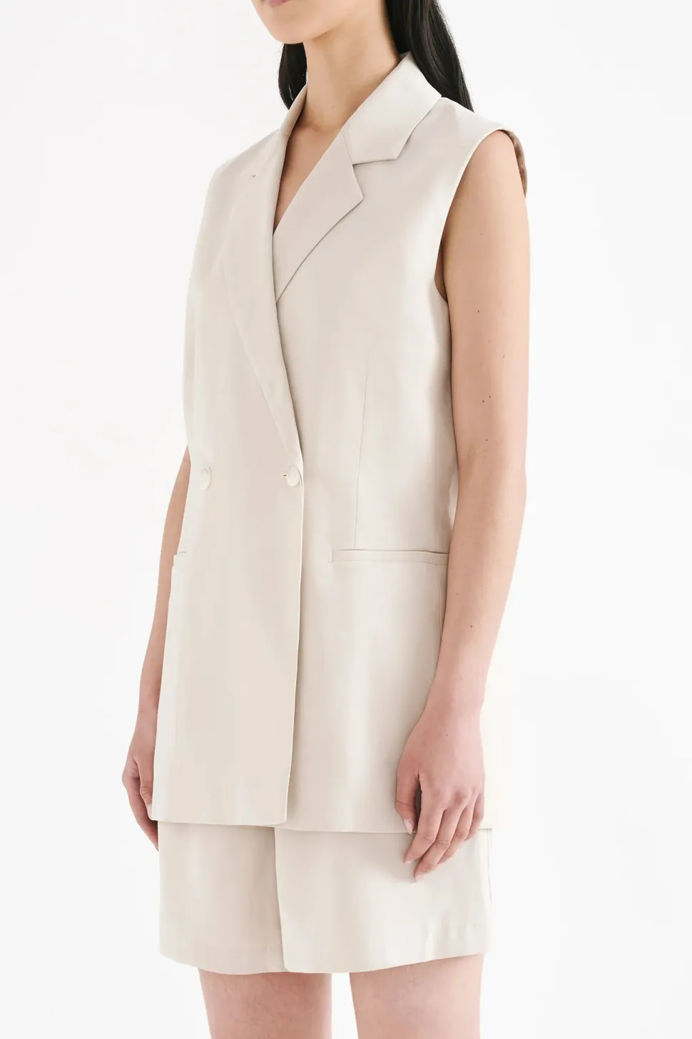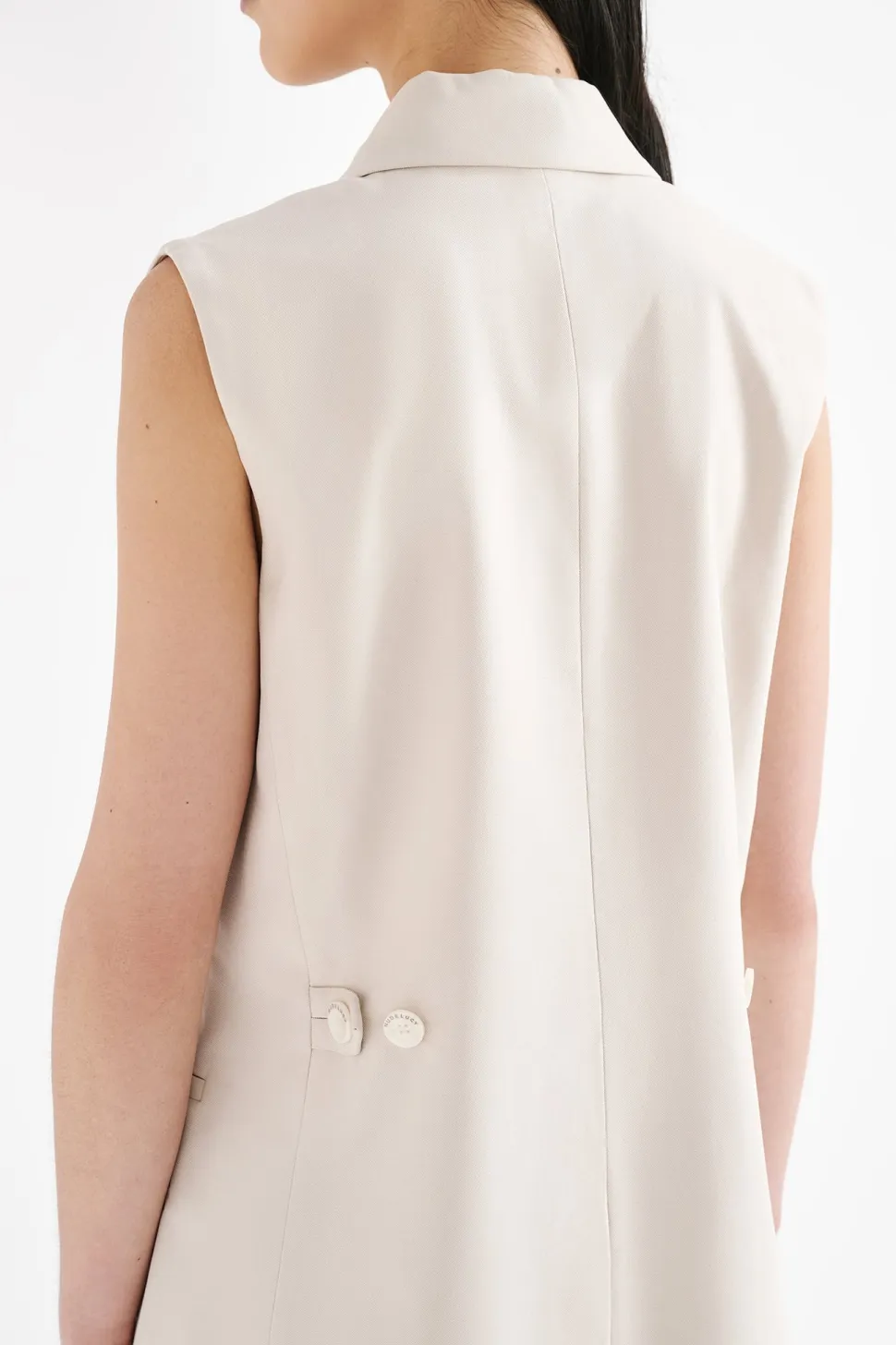 The Kit Tailored Vest is made from a classic suiting fabrication which has a smooth, structured hand feel. The silhouette is a structured double breasted with relaxed to slim fit body. Features include traditional tailoring detailing throughout including branded buttons and tailored vents at back of body.