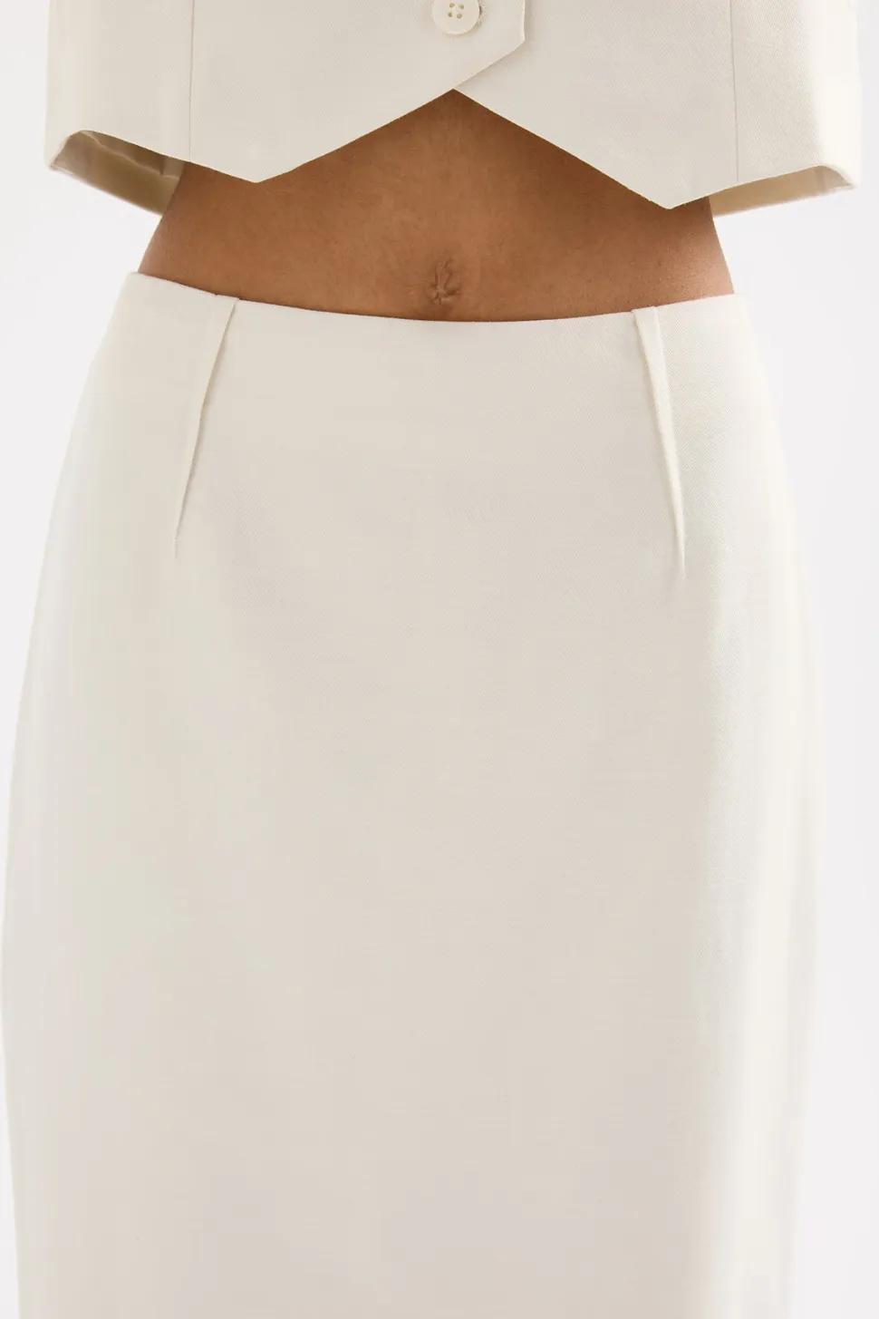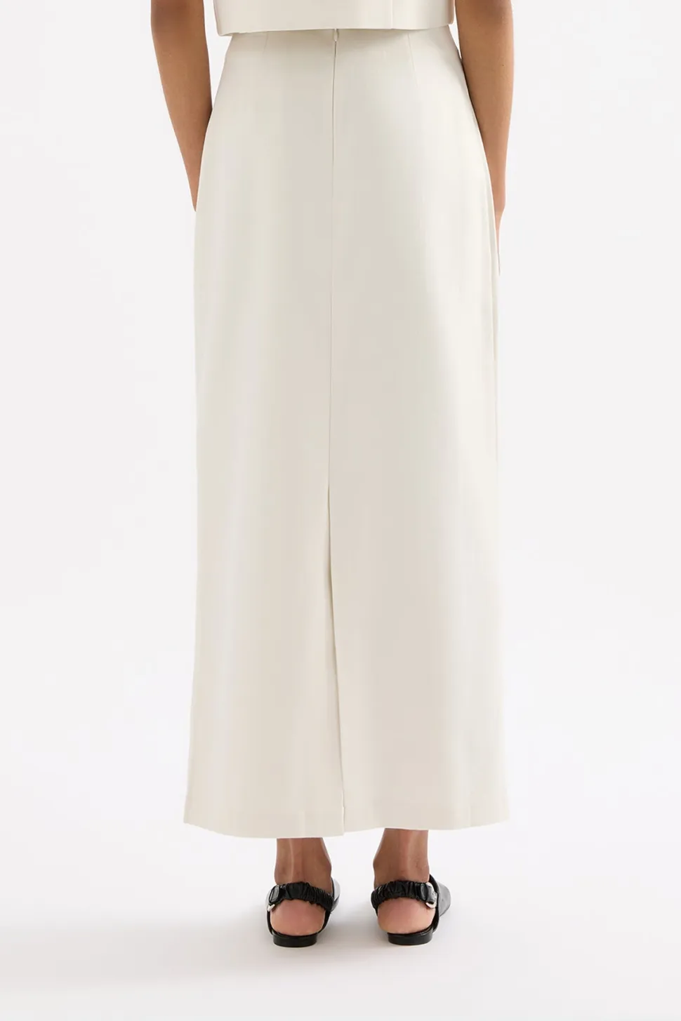 The Tait Maxi Skirt by Nude Lucy is made from a mid weight Tencel/cotton fabrication which has a textured hand feel. The silhouette is tailored, high waisted with a straight fit and maxi in length. Features include external dart detail, centre back vent and zipper opening. The Tait Maxi Skirt is fully lined.