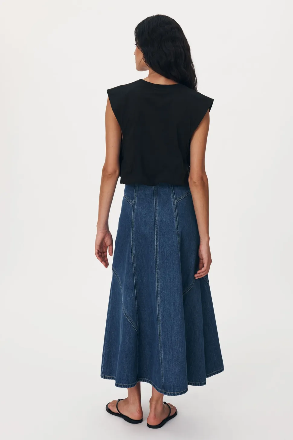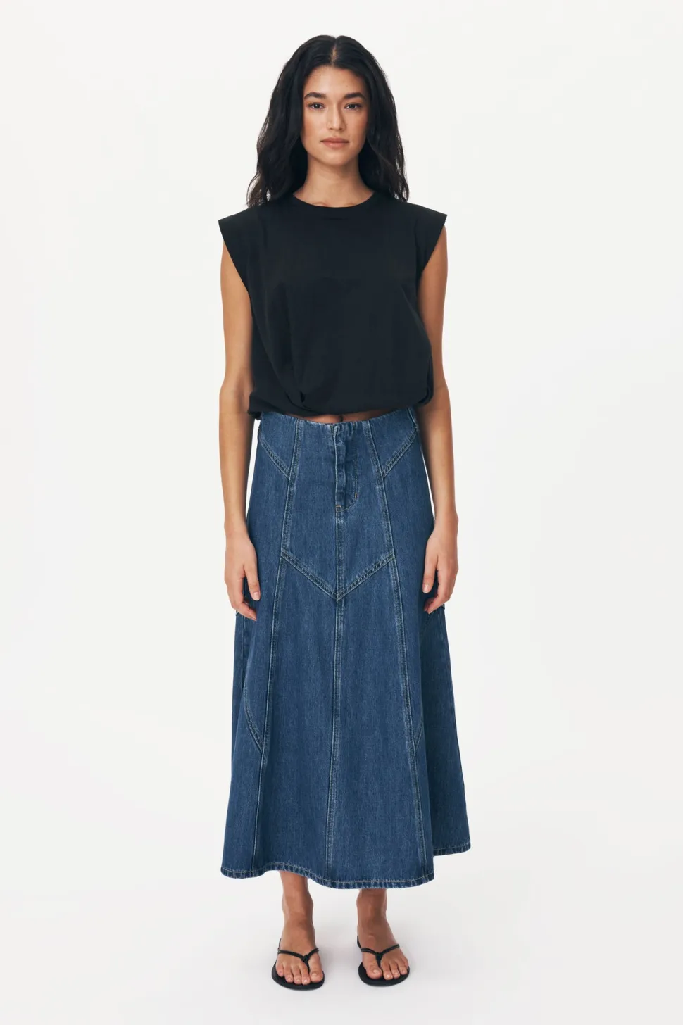 The Jeanette Denim Midi Skirt – With heavy topstitch detailing and a soft vintage feel. Jeanette is an endlessly versatile and flattering piece to take you from season to season. Style with the Mason Silk Shirt for an elevated look, or pair it back with the Hubert Knit Tank.
