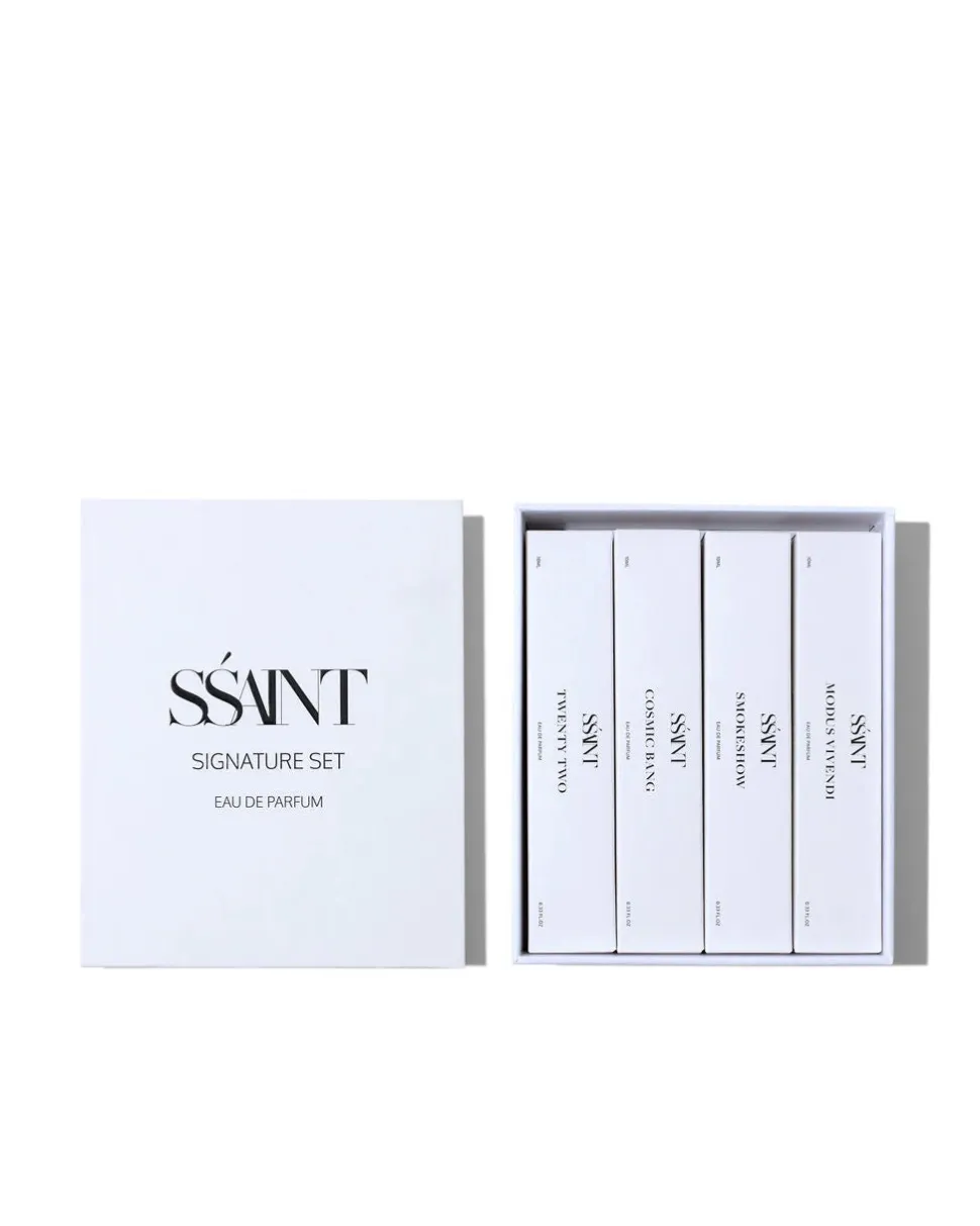 Each set contains four 10ml bottles; Cosmic Bang, Twenty Two, Smokeshow & Modus Vivendi. Allowing you to experience all of our four Signature SŚAINT scents.
