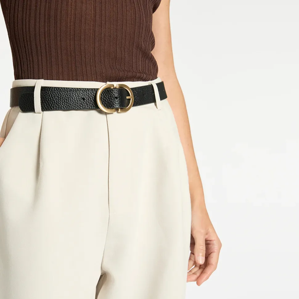 Status Anxiety ‘In Reverse Belt’ in black and silver. Features include, a premium hardware buckle, logo emboss detail on back. Crafted in a premium cowhide pebble leather.