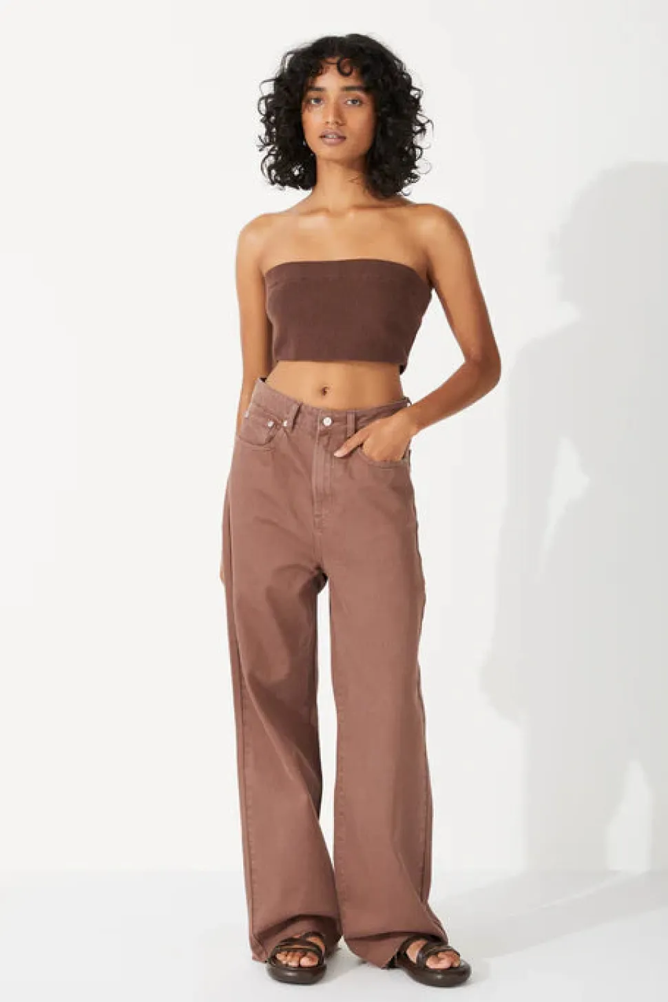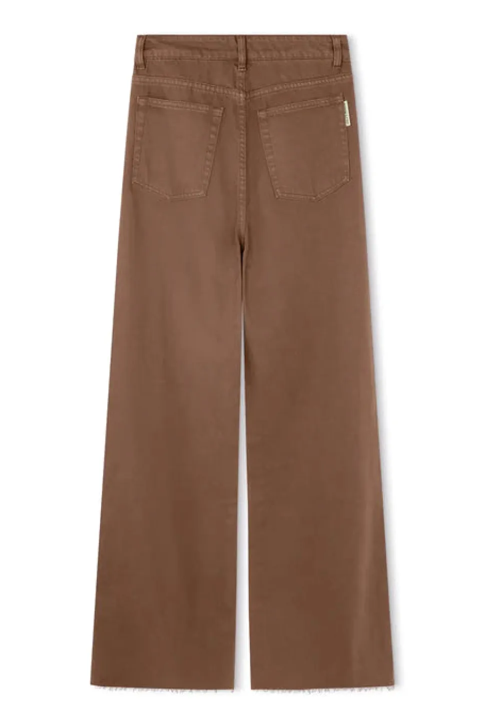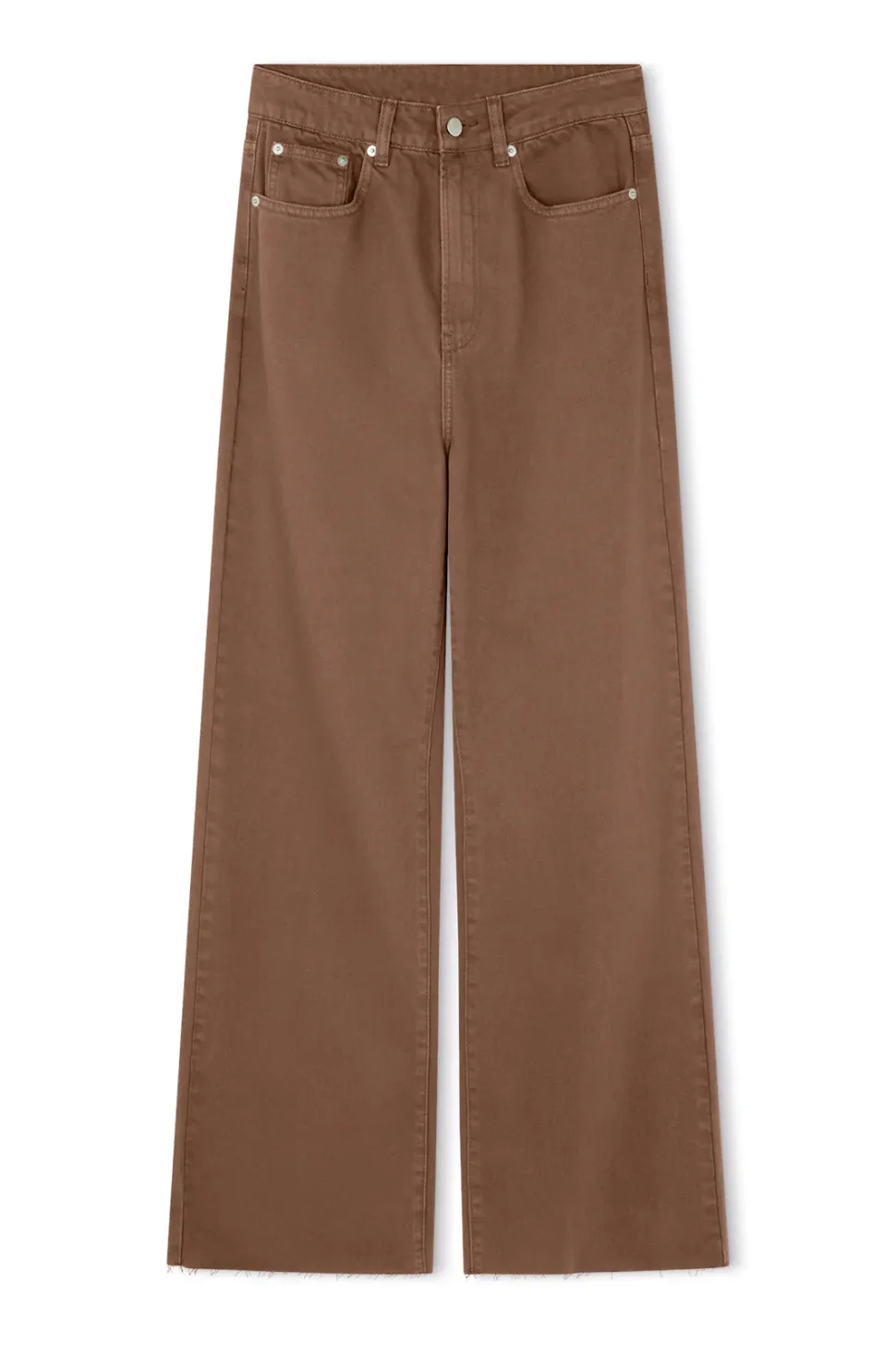 The Chocolate Recycled Cotton Straight Leg Jean by Zulu & Zephyr features a wide straight leg with a customisable raw hem finish, zipper fly closure with waistband button, and a traditional 5 pocket design, in a washed, light chocolate hue.